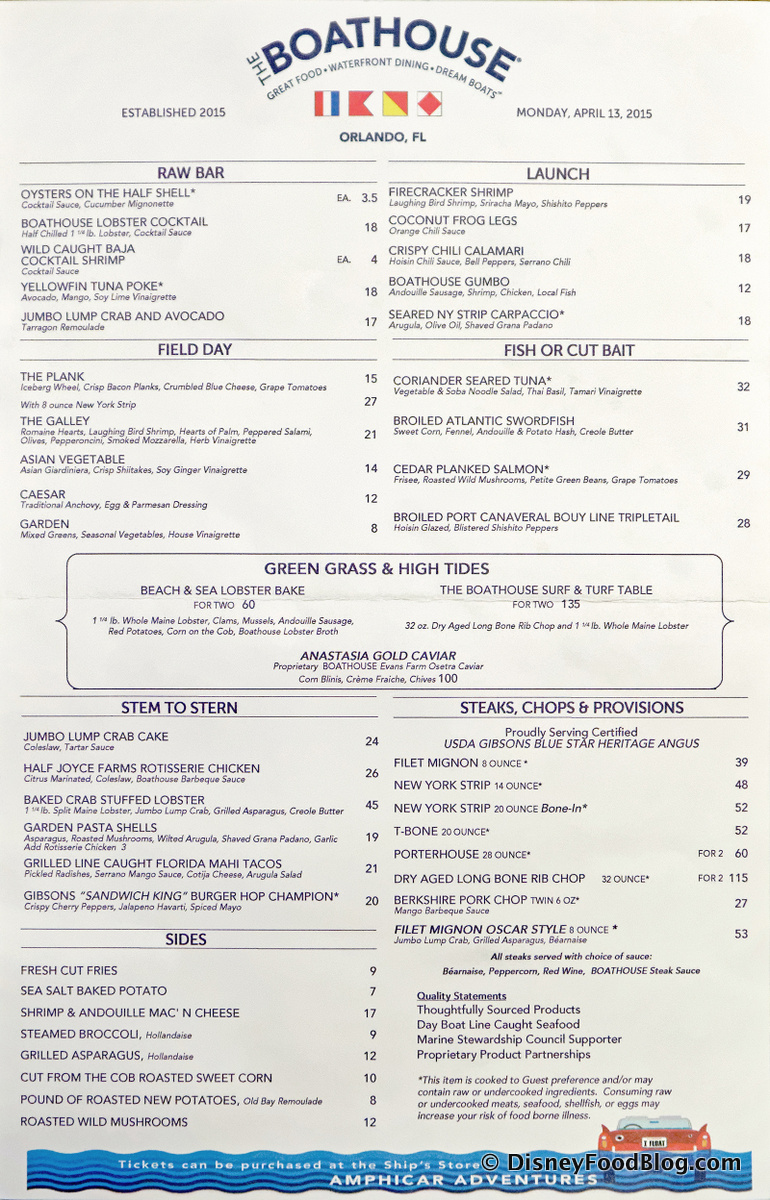 The prices seem normal to me. I live off one of the Great Lakes and the east side of town is one gigantic marina. There are several steak and seafood places down there and these prices are totally in line with all the nice marina steak and seafood houses I’ve been to. Serving sides à la carte, rather than included with the entrée, is standard practice for places like this, especially steak houses. Shula’s, Ruth’s Chris, Morton’s, Peter Luger, Bern’s, Keens, Sparks, etc. They all do it. Disney steakhouses like Yachtsman and Le Cellier that include the side are the exception not the rule.