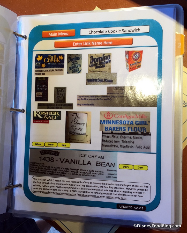 Something else my friends reminded me about… remember that if you have any questions regarding ingredients or allergy concerns, you can always speak with Cast Members working at the location. They may be able to produce one of these handy binders showcasing nutritional information, ingredients, etc.