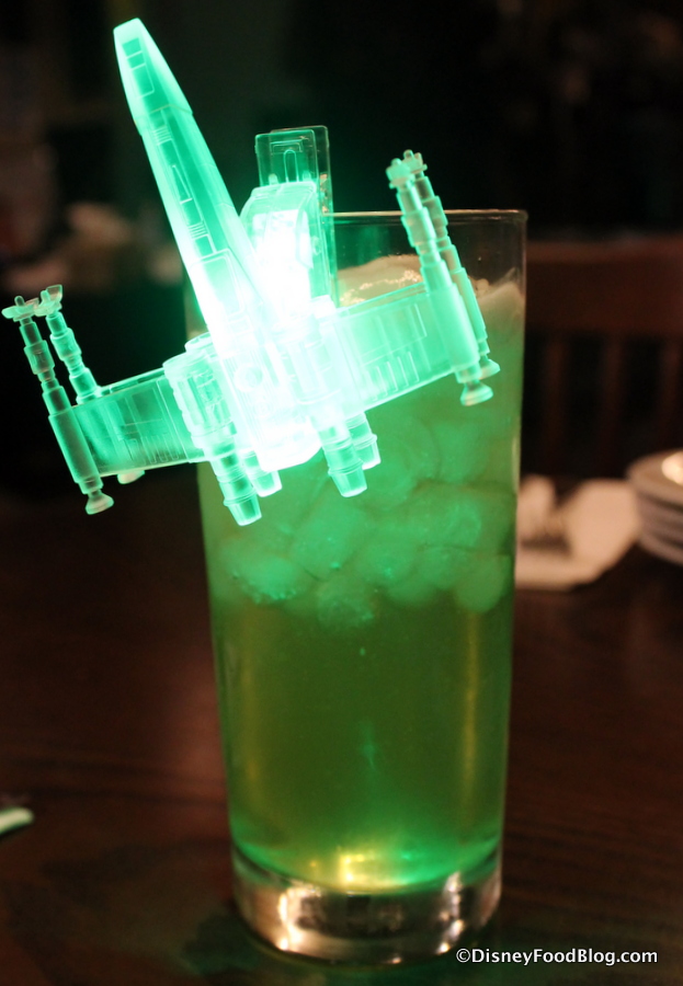 While the X-wing is pictured in the menu, our server actually gave us a choice of three items: a Millennium Falcon glow cube, a Death Star glow cube, or the X-Wing glow clip. It’s worth noting that you can get the Millennium Falcon or the Death Star at any of the pop-up bars around Hollywood Studios during Star Wars Weekends (we’ll be taking a closer look at those in an upcoming review), but the X-Wing is reserved for the Rebel Hangar. Like its counterpart cubes, it can change color if you set it to do so.