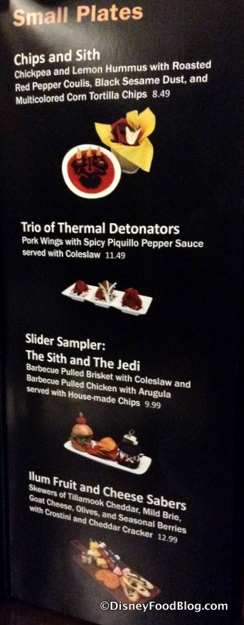 The menu at the Rebel Hangar focuses on small plates… with a Star Wars twist, of course! Fans will enjoy choosing from items like Pilot’s Pommes Frites, Ilum Fruit and Cheese Sabers, and a Trio of Thermal Detonators.