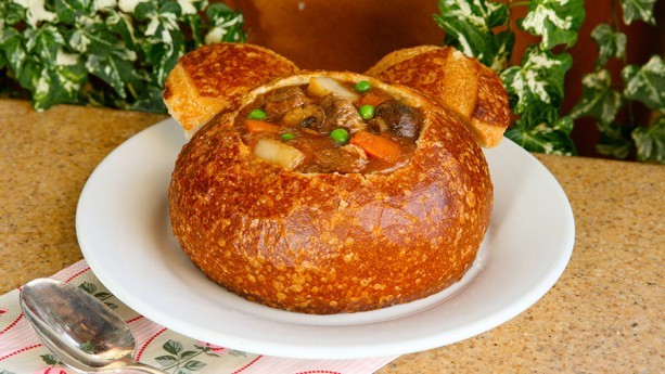 Three cheers (and two ears!!) for the Mickey-shaped bread bowls filled with Creamy Corn Chowder or Slow-Roasted Louisiana Beef Stew.