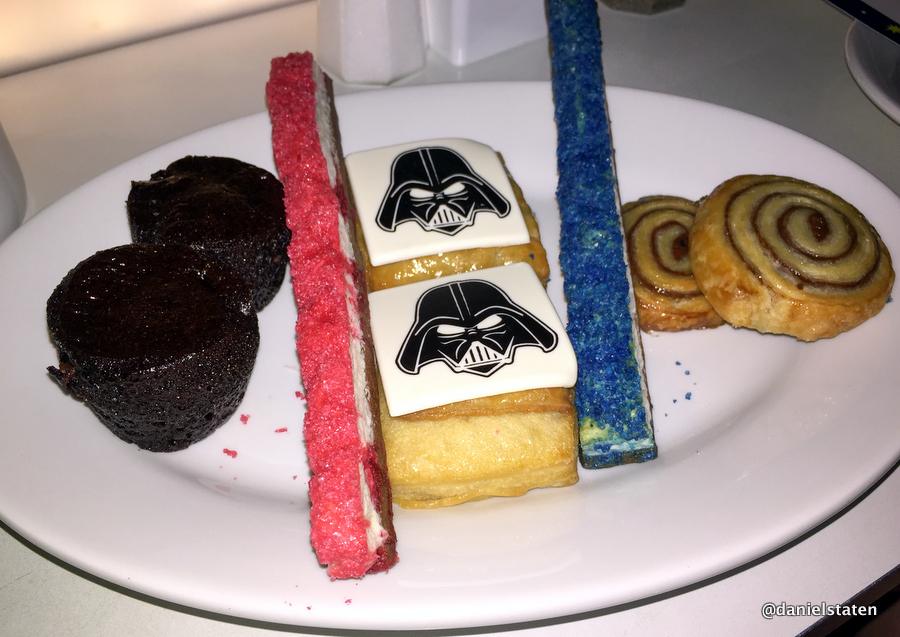 We were presented a plate of Star Wars themed pastries to begin with. My favorite was the Darth Vader cream-filled danish. It was flaky, light and had a vanilla flavor throughout. The sugar-coated Lightsabers were delicious as well. There were red and blue Lightsabers to choose from, representing the Galactic Empire and Rebel Alliance.