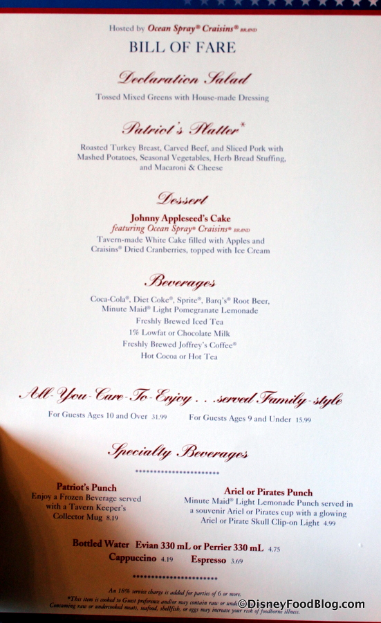As I mentioned before, if you dine at Liberty Tree Tavern for dinner, you’ll be partaking in a prix fixe, family style meal. That means that each person in your party will pay a set price — one price for adults, and a lower price for children. (Children under 3 are free.)