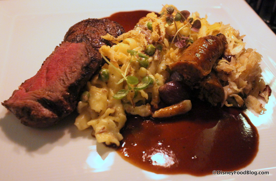 On to the entrees!Ā I chose the 64°C Buffalo! Buffalo!! Buffalo!!! (being from Buffalo, NY, I figured this was an obvious choice for me). As you may have guessed, the dish included Buffalo served three ways ā a Strip Steak, Chipped Buffalo Mac and Cotswold Cheese, and Buffalo Sausage.