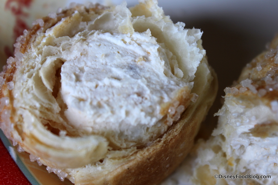 First, a little history on the Troll Horn (well, Epcot history, anyway). It was originally known in Epcot as the Cloudberry Horn, featuring cloudberry jam mixed with cream tucked inside the horn-shaped pastry shell. Then suddenly it was renamed the Troll Horn, due to — as I understand it — a shortage of cloudberries in Norway, so the updated (at the time) Troll Horn was instead made with Lingonberry jam.