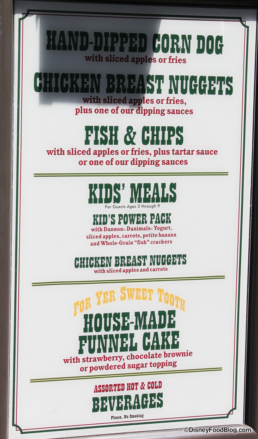 Now, when it comes to eats, Stage Door Cafe does very few things… but it does them all well! You can see the menu has only three entrees: two Disney Parks standards — Fish & Chips and Chicken Breast Nuggets — and one Disneyland specialty: the Hand-dipped Corn Dog! (This spot does share a kitchen with the Golden Horseshoe, so many of the menu items will be the same.)