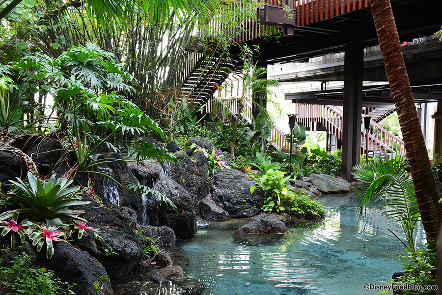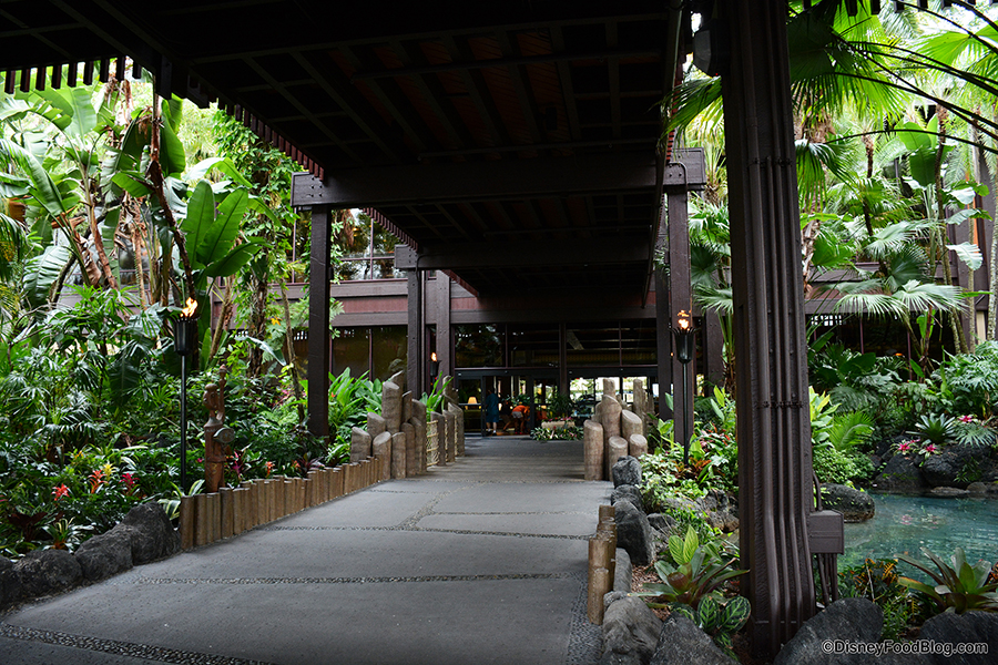 As mentioned, you can order Tonga Toast at two Polynesian Village Resort restaurants, and if you’re arriving via bus or car, you’ll need to make your way past the entrance into the Polynesian Village Resort lobby. If it’s been a while since you’ve seen the entrance unsurrounded by refurbishment walls on one — if not two — sides, here’s what it (along with some general landscaping) looks like these days.