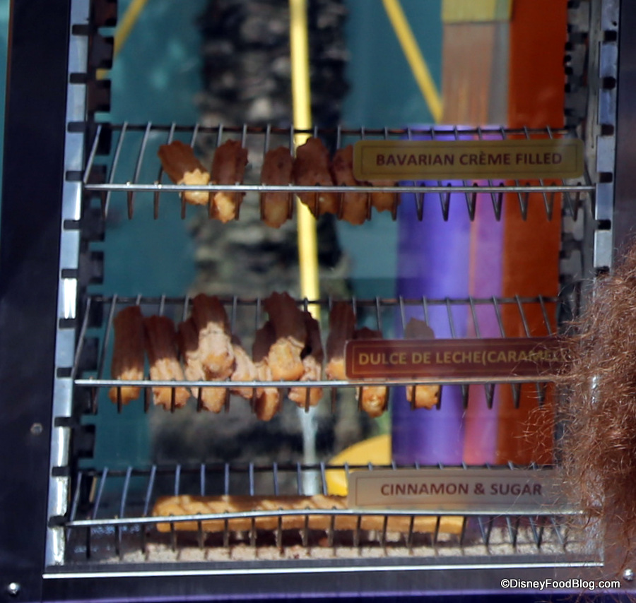 The main sign tells you ice cold treats are the headliner, but it just so happens you’ll find a variety of Churros here as well: typically Bavarian Cream, Dulce de Leche (caramel), and King Cinnamon and Sugar. (Alas, those Churro Ice Cream Sandwiches in Disneyland never made their way to the east coast).