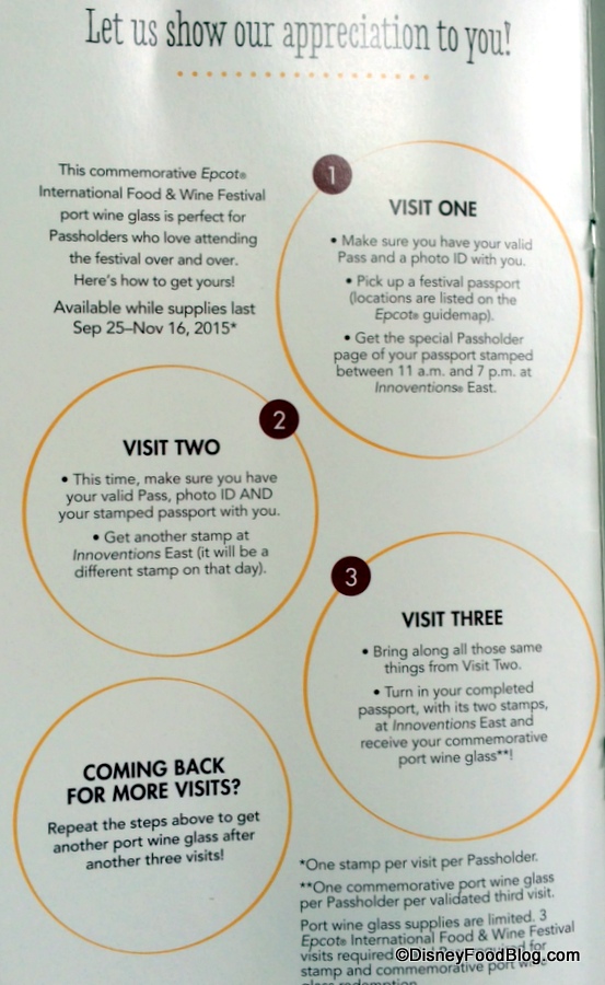 On your first visit to the Epcot International Food & Wine Festival, pick up your Festival Passport from any of the locations listed in your Guide Map. Be sure to have your valid Pass and valid photo ID with you.