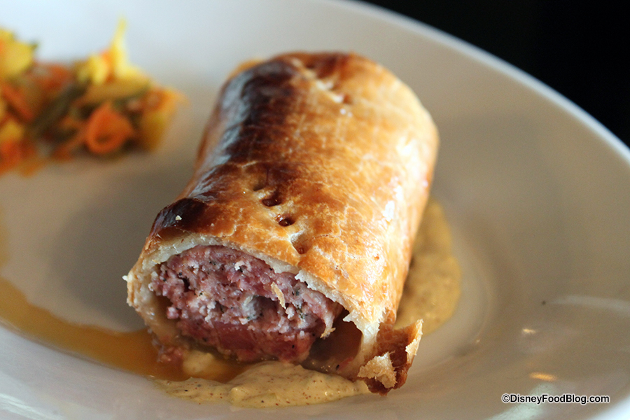 This dish is a somewhat modern twist on a traditional favorite. A Sausage of Pork and Apple is encased in a Short Dough, similar to a savory pie dough. The whole thing is shaped into a roll, rather than an enclosed shape like a pie or turnover. It’s served with a side of traditional sweet and sour Piccalilli.