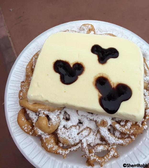 Sherri Robb shared a photo of a Funnel Cake topped with a slab of ice cream (and a few not-so-Hidden Mickeys!) from a recent visit to Epcot! Many I love that ice cream slab.