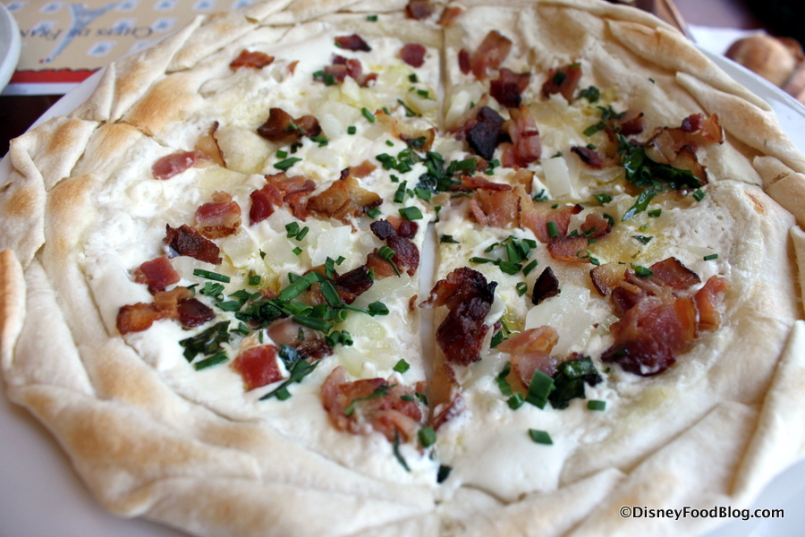 But I always love to order the A la Flamme Alsacienne. I don’t order it on every visit, because I DO have to try new things from time to time, but I have a special place in my heart for this one. The free-form tart is similar to a flatbread, but is made with short pastry instead of bread-like dough. It’s topped with Crème Fraiche, Onion, and Bacon, and it’s heavenly.