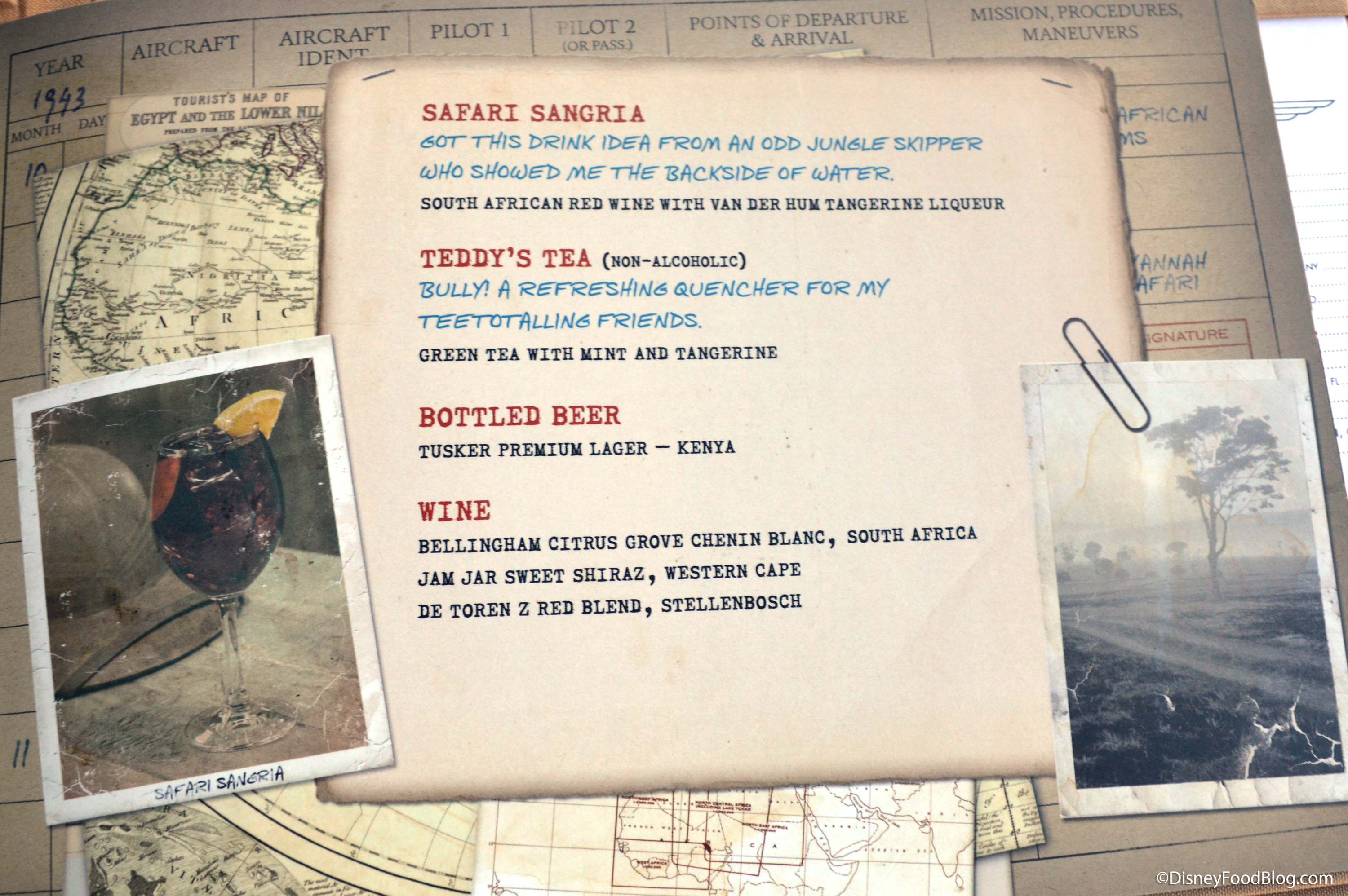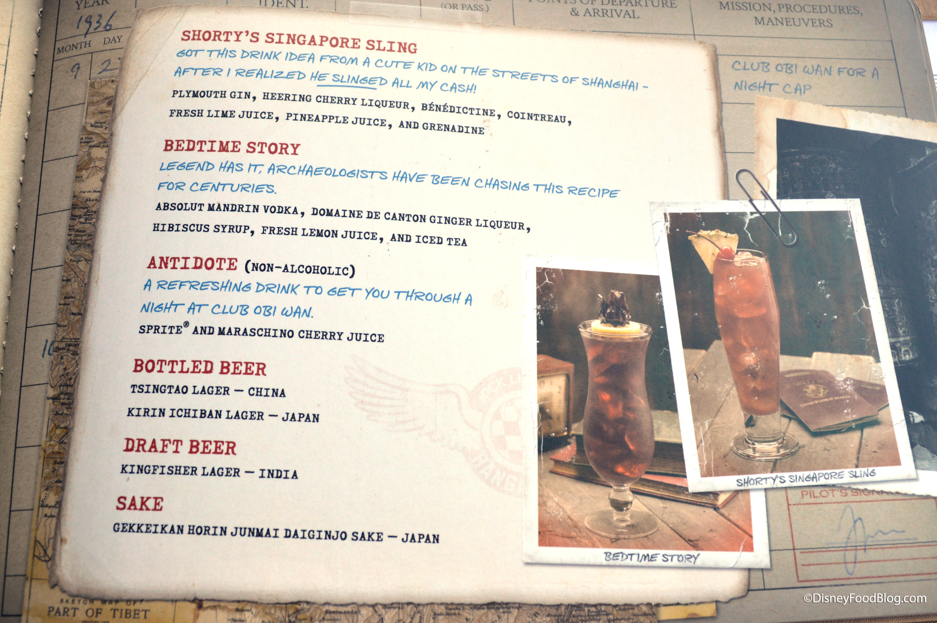 We’re starting with drinks in this watering hole, with a menu — I mean, Pilot’s Log Book 🙂 — chock full of specialty libations, perfectly themed to their surroundings!