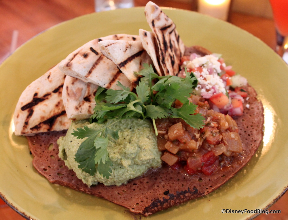 The Snack of Ra is a somewhat larger plate made up of African salads and dips with injera flatbread and naan crisps.