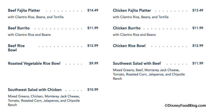 Starting with the entree choices: Fajita Platters — with either beef or chicken — seem to be the star entree, and Burritos have a presence as well. All are served with Cilantro Rice and Beans, something we’re already familiar with from Tortuga Tavern (a seasonally-open Counter Service restaurant, which is also currently rumored to be facing a menu change of its own). Beef, Chicken, and Roasted Vegetable Rice Bowls, along with a couple of variations on a Southwest Salad round out the entree choices.