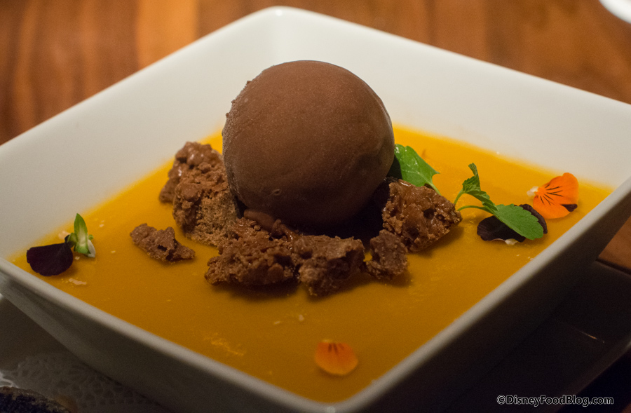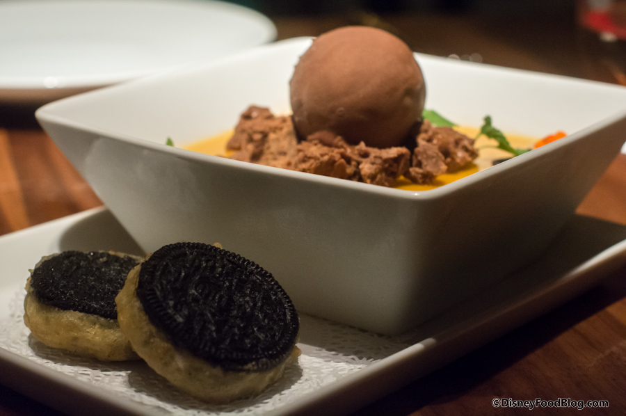 The Chocolate Cream & Crunch — mandarin orange jelly and dark chocolate gelato topped with hazelnut chocolate crunchies — wasn’t as much my jam. (I’m not a huge fan of flan, which is ultimately what this reminded me of). But this dish was more than saved for me by the addition of a little something called Oreo Tempura.