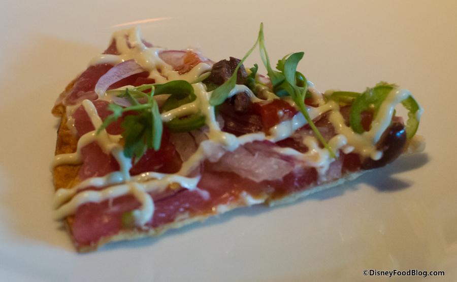 The Tuna Pizza is somewhat like a deconstructed tuna roll, with tuna sashimi, tomato, jalapeño, and anchovy aioli topping a crispy tortilla. We anticipated a great deal of heat due to the peppers, but it was actually quite mild.