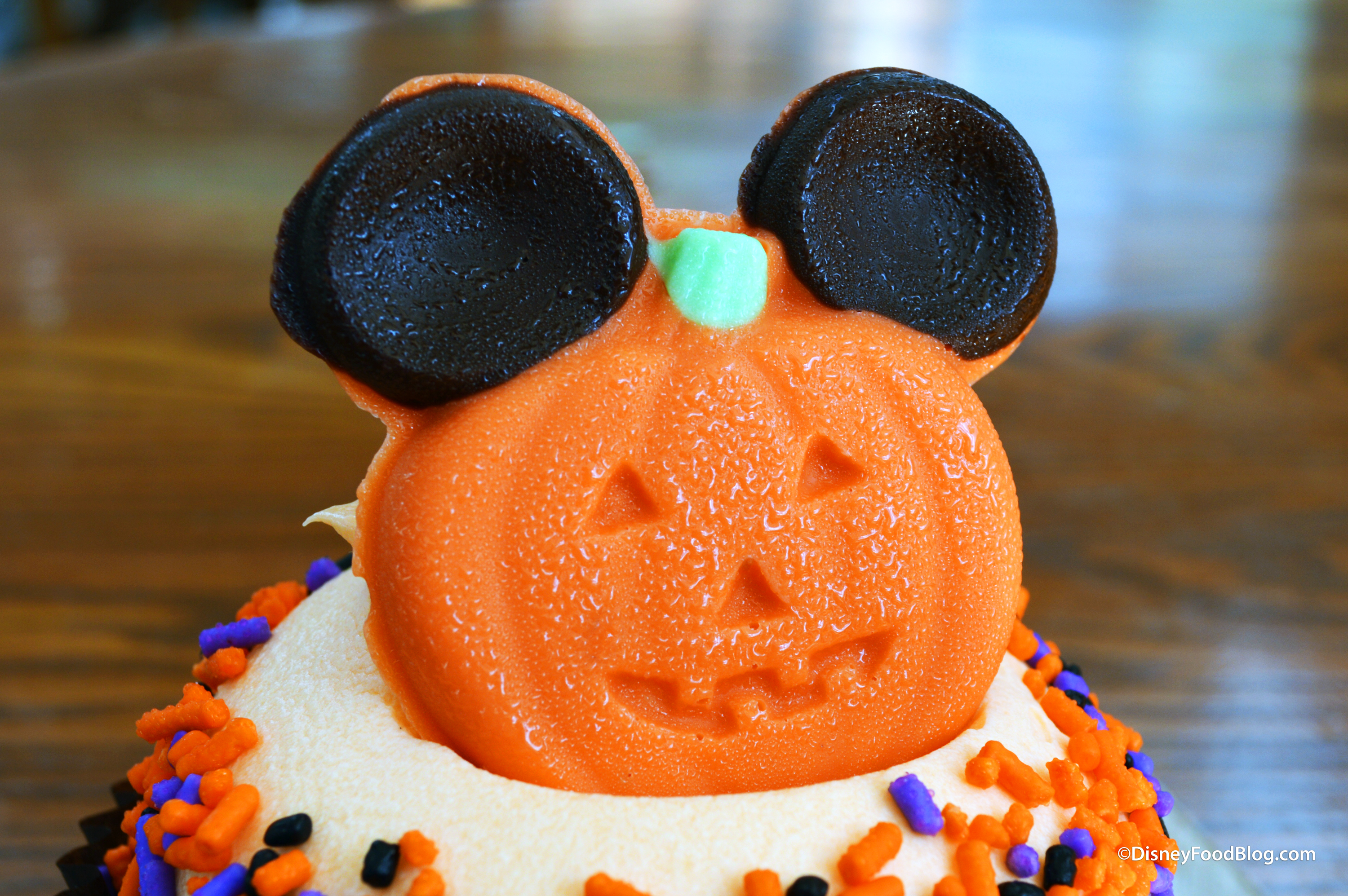 Of course, what Halloween-themed anything is complete without CANDY?! Orange and purple sprinkles on top add a touch of extra sweetness along with a bit of crunch. And your Pumpkin Mickey topper is indeed edible (it’s made of white chocolate), so get your photo ops in right away before he starts to melt…or sweat!