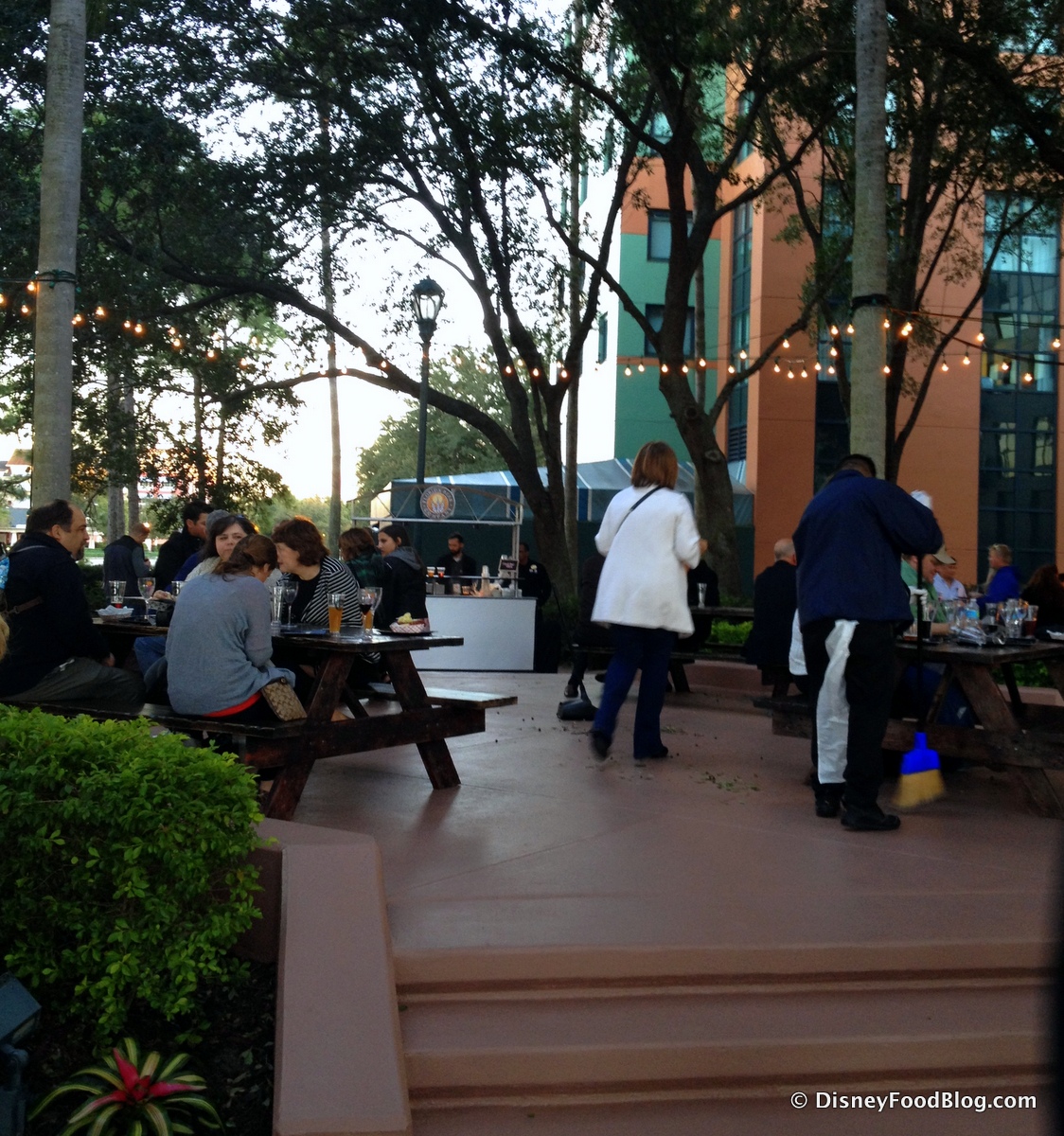 The terrace, strung with lights and surrounded by trees, is a very nice location as night falls.