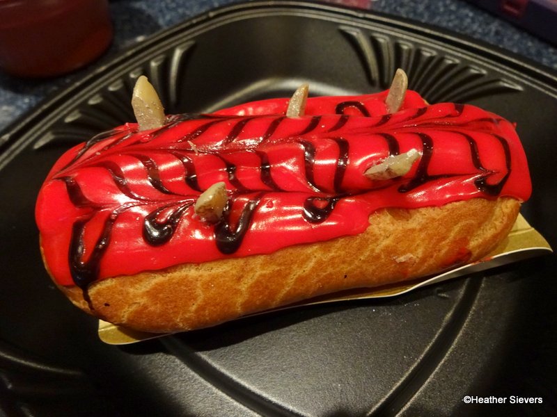This Darth Maul Inspired Eclair is topped with red frosting, chocolate feathered details, and almond “spikes.” It’s filled with a “spicy” milk chocolate cream center that has the consistency of pudding.