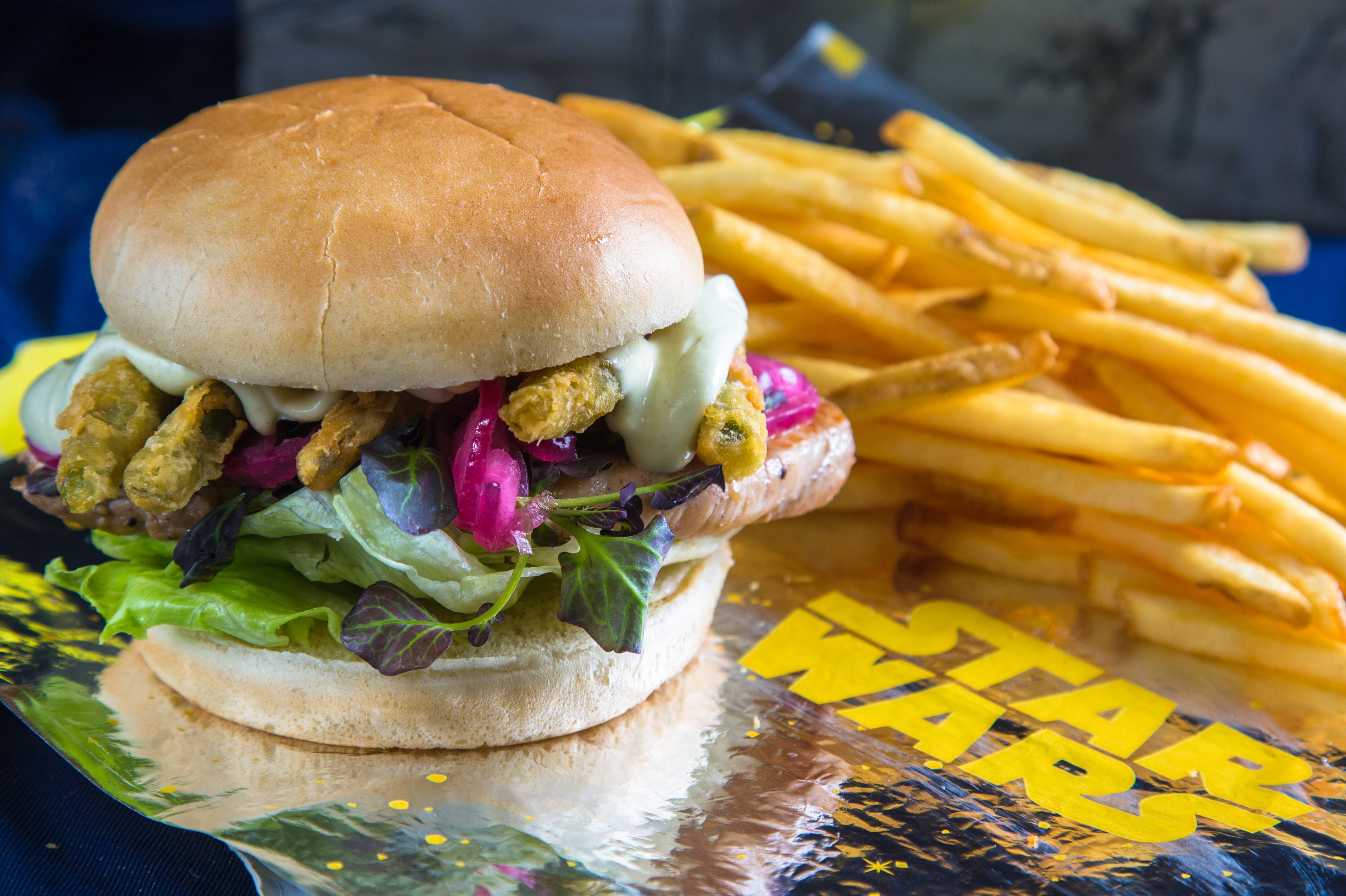 I didn’t have a chance to try the Jedi Order Chicken Sandwich, which I’m mad at myself for not grabbing! Somehow I accidentally skipped it when ordering, but it sounds really interesting; Five Spiced Chicken Breast topped with Fried Green Beans (the Trader Sam’s ones!), Pickled Red Onions, Watercress, and Wasabi Mayo. It’s served on a fresh bun with a side of French Fries or Fresh Fruit.