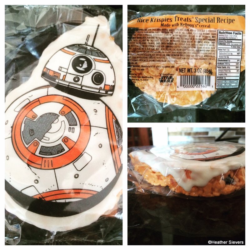 The third option is a really adorable BB-8 Rice Krispies Treat. The orange colored Rice Krispies make up BB-8’s body. They are mixed with black and orange M&M’s candies and it’s topped with white chocolate and an edible BB-8 image.