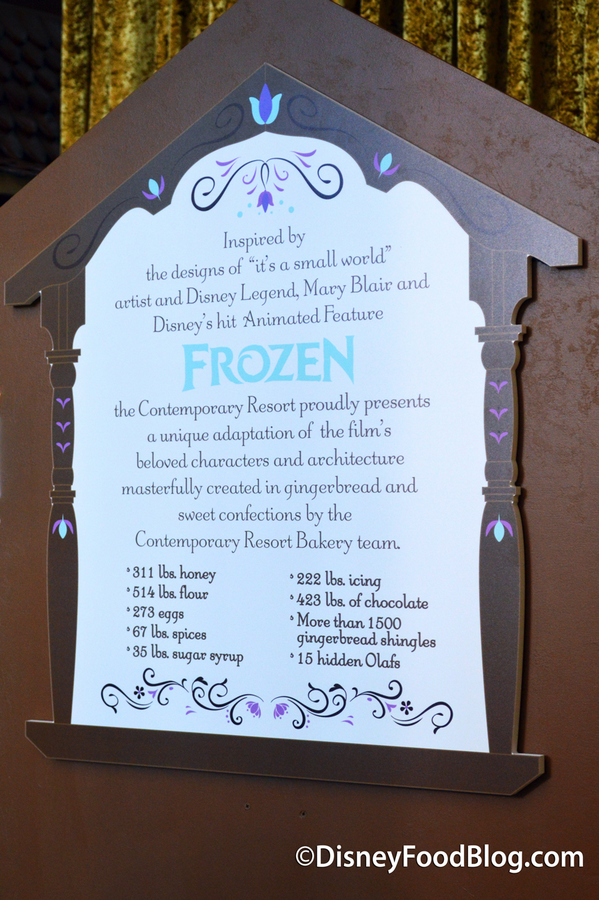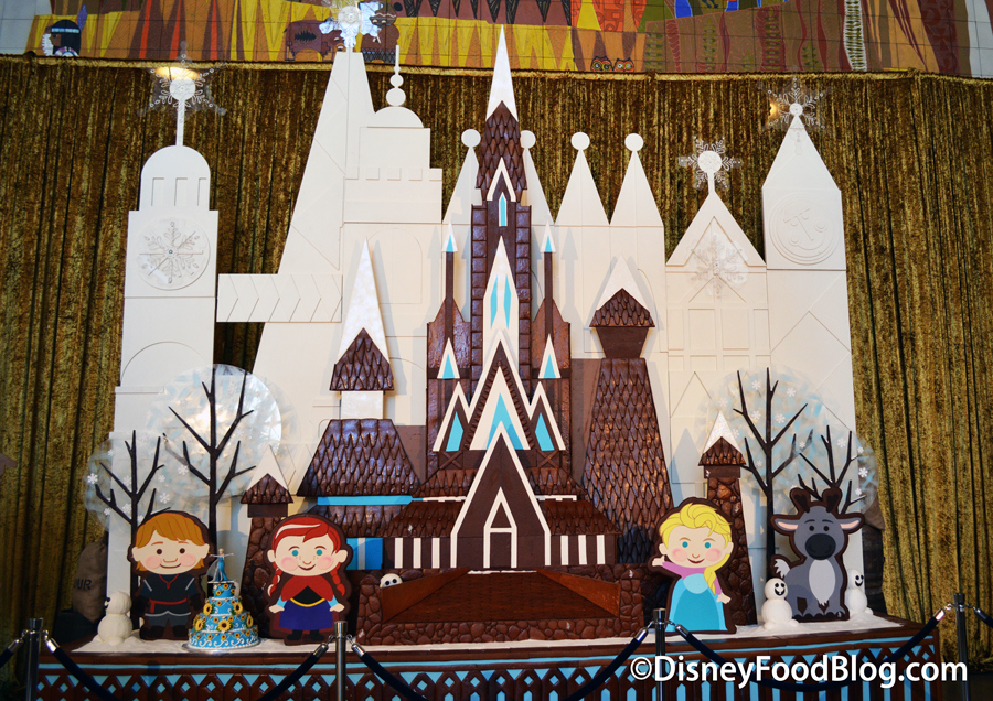 The Contemporary Resort display has received a “Frozen”-themed overlay for the second year in a row, featuring Elsa, Anna, Kristoff, and Sven placed in front of the Mary Blair-inspired gingerbread display.