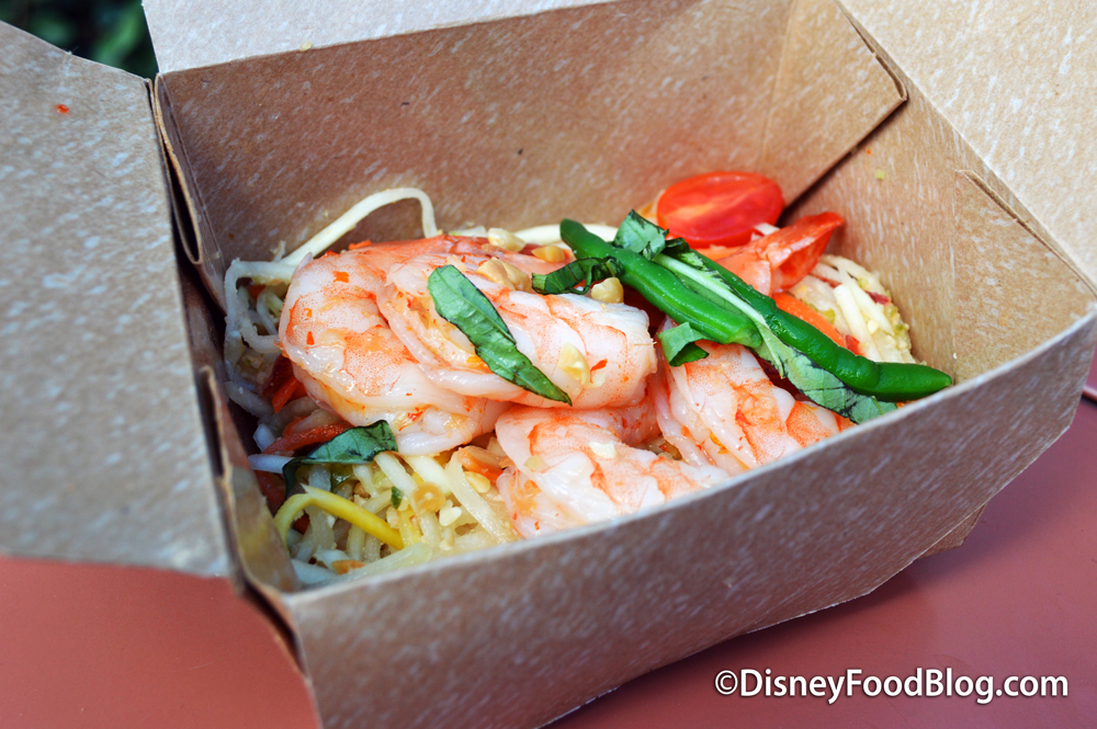 The portion size and brown paper box packaging brought to mind the Trek Power Salad at the Smiling Crocodile (that’s the new name, by the way, for what was previously known as the Gardens Kiosk). I gotta say, Animal Kingdom has definitely stepped it up with some intriguing salad options over the past year. As for the Som Tam, the shrimp were HUGE and tasty! The chilis added a nice heat without being too spicy.