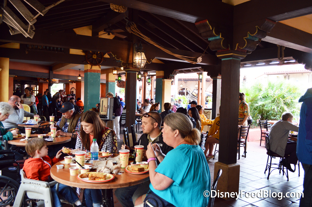 The expansive outside dining area is partially covered and offers a great view of the walkway through Adventureland.
