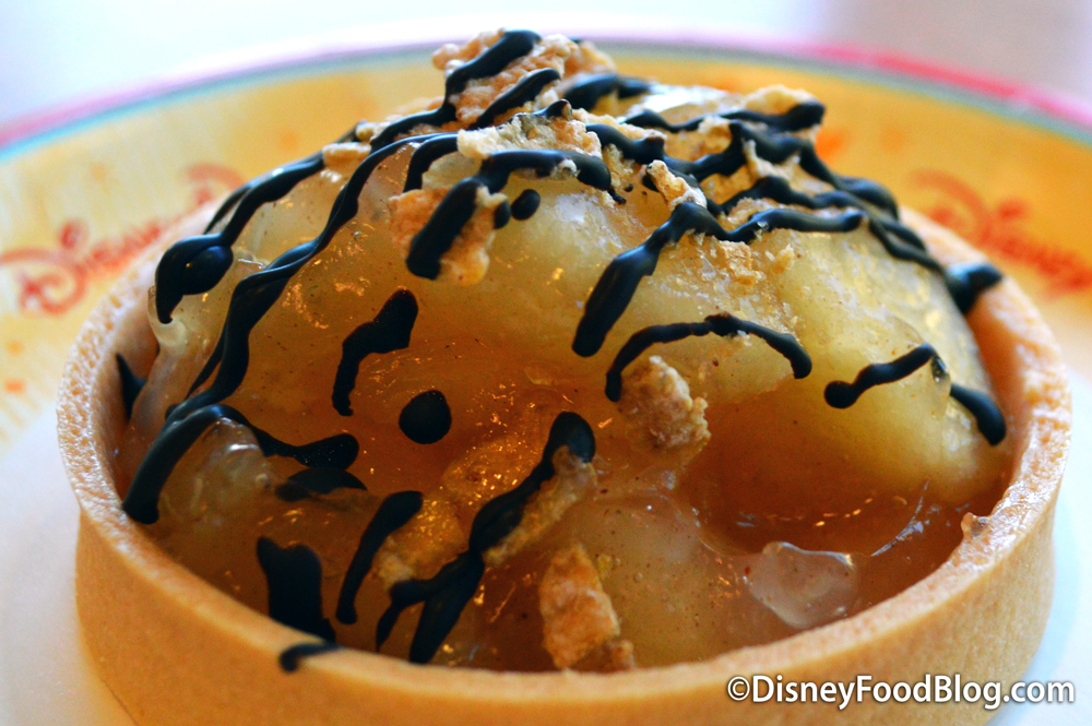 Now, once again we’re looking at some mini treats here, so to offer some size perspective I placed all three of my chosen tarts on one plate. And this is one of the smaller snack and dessert plates, mind you. They’re $4.79 apiece, and eligible for a snack credit on the Disney Dining Plan.