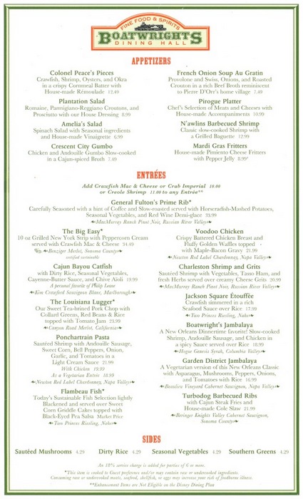 I had the Jackson Square Etouffee on our last visit. It was delicious! In addition, by Disney standards (and pretty much any other standards) the portion was GINORMOUS. So much so that what we took back to the townhouse was enough for both my wife and I for supper the next evening (and we are not exactly light eaters). We’ll definitely be back.