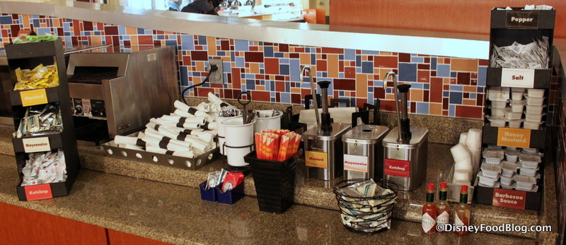 Time to grab your drinks and condiments! If you aren’t using a Rapid Fill Mug, you’ve received a disposable cup to collect your drink. The choices are standard Disney. Choose from a variety of Fountain Drinks.