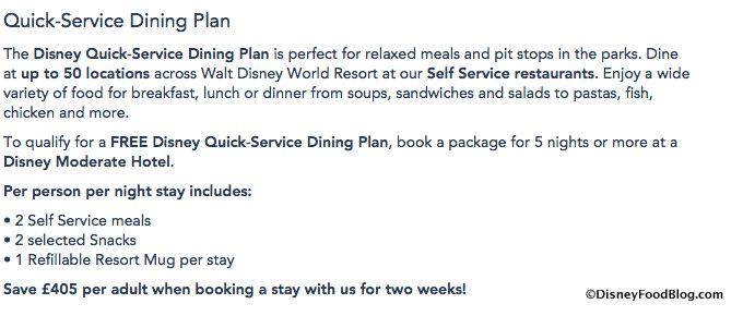 According to the screenshot below from the United Kingdom Disney Holidays Free Dining promotion page, the Quick Service Dining Plan for 2017 will include: