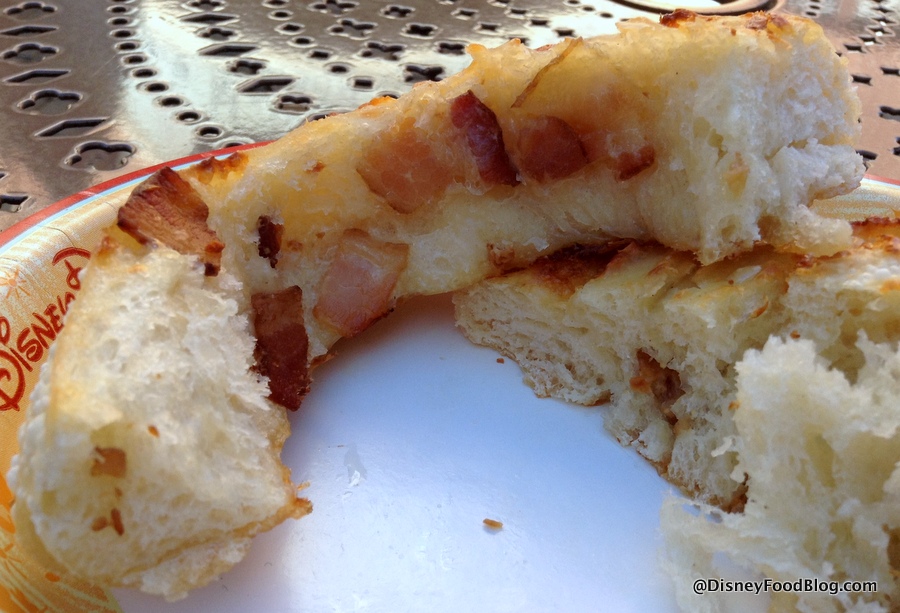 It’s a nice use of a snack credit on the Disney Dining Plan, for sure, but at $3.95, it’s not a bad out of pocket deal at all considering how hearty and tasty it is. Between the bread and the surprising amount of meat packed in the roll, it makes for a truly filling breakfast. (I should note, though, that I believe these are typically sold throughout the day, so if you’re craving some bacon as a later day snack or a mini “Brinner,” this could do the trick for ya!)