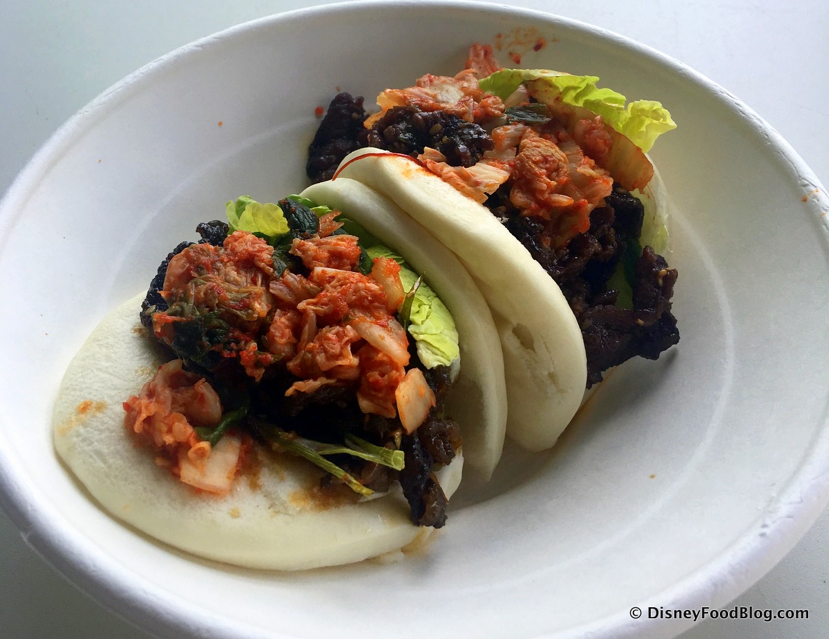 But we knew we had to give the Bao Tacos a try as well. We chose the — you guessed it! — Kalbi Bao Tacos. The filling for the Steamed Bun Tacos was Beef Short Rib with Butter Lettuce garnished with Kimchi and Scallions.