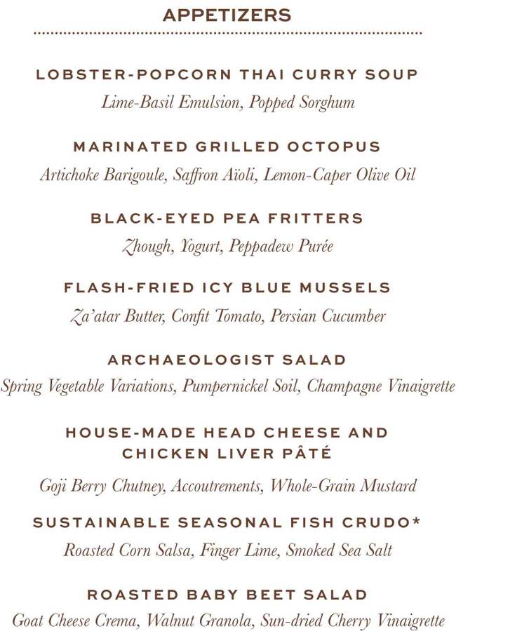 Appetizers include Lobster-Popcorn Thai Curry Soup and Marinated Grilled Octopus for starters, among others.