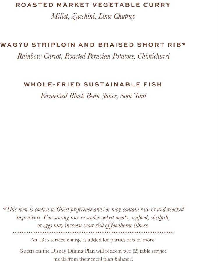 The entree list continues with items like Wagyu Striploin and Braised Short Rib (please note that it is confirmed here that Tiffins will require two Table Service Credits on the Disney Dining Plan).