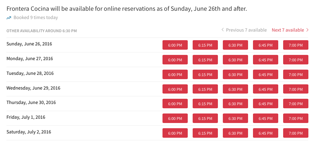 Because Frontera Cocina by Rick Bayless (host of “Mexico — One Plate at a Time” among numerous other achievements) will open on June 26, 2016! Well, at least according to Open Table — the online reservation booking engine. Tables are available to book at 6:00 pm daily for dates beginning Sunday, June 26th.