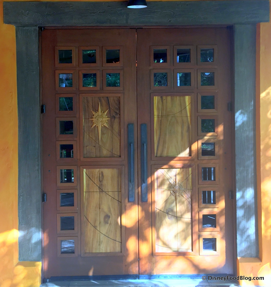 The double doors that serve as the main entrance to Nomad feature simple carvings in the insets, with two compass roses.
