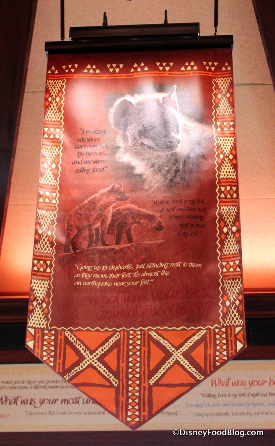 The banners hanging from the ceiling ask questions regarding the experience of travel. The answers of Disney Imagineers who traveled to other countries during their research for the creation of Animal Kingdom are also printed on the colorful banners.