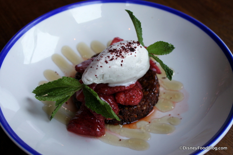 But here comes our favorite choice of the day — the Pork by Pork. The dish offers Pork prepared two ways: Sage and Onion Stuffed Pork Loin, and Cider Braised Pork and Apple Fricassee. The whole thing is topped with a pork cracklin’ (which, incidentally, is the second time I was served cracklin’s at a Disney restaurant on this trip — maybe it’s a trend).