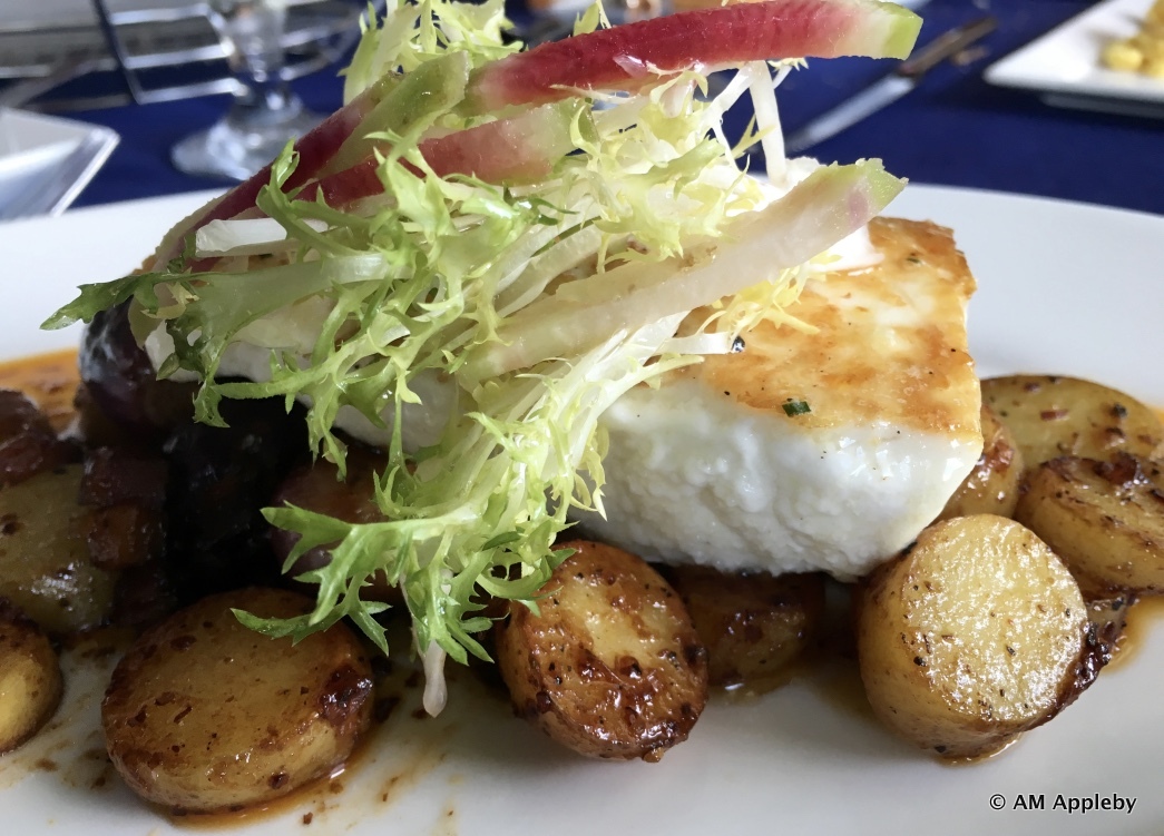A sweep of crumbs by Nelson and our entrées arrived. Gorgeously plated, the Halibut was a visual delight. The pan seared fish sat high atop a bed of potato-bacon hash and wilted greens. I almost forgot to take this photo before picking up my fork! The fish was crispy and buttery outside and tender and flaky inside, and the potato slices in the warm mustard vinaigrette melted in my mouth.
