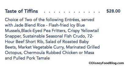 From 11:30 am – 3:30 pm daily, guests can pick two from the list of entrees for a set price of $28.00 — a great way to try the unique flavors of Tiffins at a lower price point than the full-sized entrees.