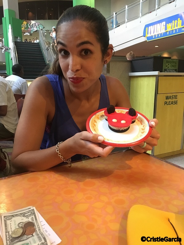 A couple weeks ago we reviewed the Mickey Oreo Cheesecake at Sunshine Season’s in Epcot’s The Land pavilion. This week our friend Cristie Garcia shared a photo of herself – enjoying a Mickey Oreo Cheesecake! So fun!