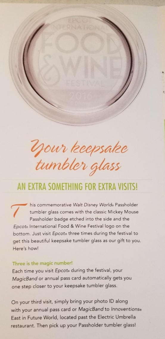 To obtain your Passholder Keepsake Tumbler, visit the Epcot Food and Wine Festival three times, and use either your Annual Passholder Card or your MagicBand to validate your visits.