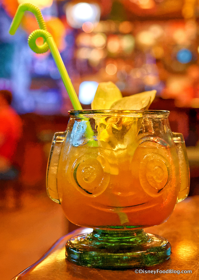 This Hawaiian Mai Tai is a little sweeter than the Captain’s Mai Tai typically served in other Disney bars with its use of agave nectar, almond syrup, orange curaçao, and lime juice (the use of just one type of juice gives this drink its stronger taste). THIS is the beverage which brings on the cry of “TWO SHOTS OF RUM!” — specifically, Coruba Dark Rum and Bacardi Superior — whenever it’s order by a guest. The garnish is a Hawaiian flower with pineapple leaves… ‘cuz pretty much anything goes when it comes to Trader Sam’s.