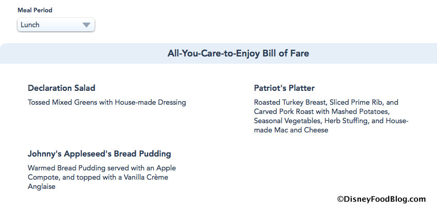 And it’s the lunch menu in particular that is the recipient of the recent changes. The main one being that — while a la carte options DO still exist — the All-You-Care-To-Eat Patriot’s Platter is now an option for lunch time, too, in addition to dinner. Here’s a look at just the first portion of the newly updated lunch menu.