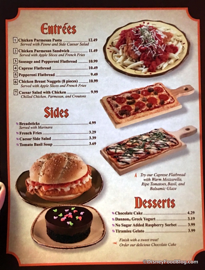 Returning to the very front of the park, a House Salad has replaced the Insalata Fresca at Tony’s Town Square, and an Italian Cheese Dip has joined the Appetizer list.