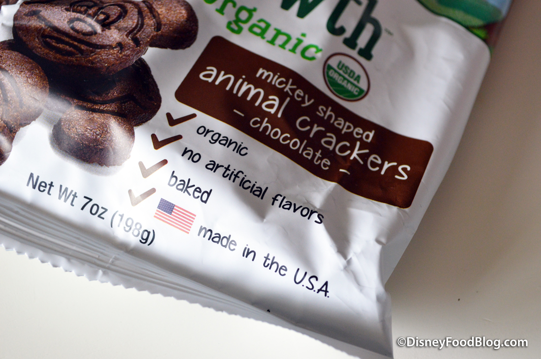 Mickey is on the packaging that contains 7 ounces of animal crackers (FYI — according to the Pure Growth Organic, a 7-ounce package contains about 70 individual crackers, which seems like a pretty filling snack to me)!
