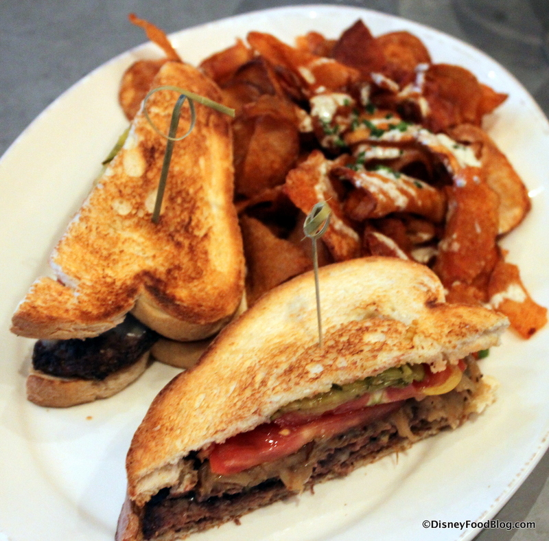 Another friend decided to try one of the the sandwich selections and went for The Hamilton. This homespun take on a burger combines two Beef Patties, White Cheddar, Grilled Onions, Chow-Chow Relish, Bread and Butter Pickles, and Tomatoes — all served on thick sliced, Griddled Bread. House-Made Chips with are drizzle of Icebox Dressing serve as the side.